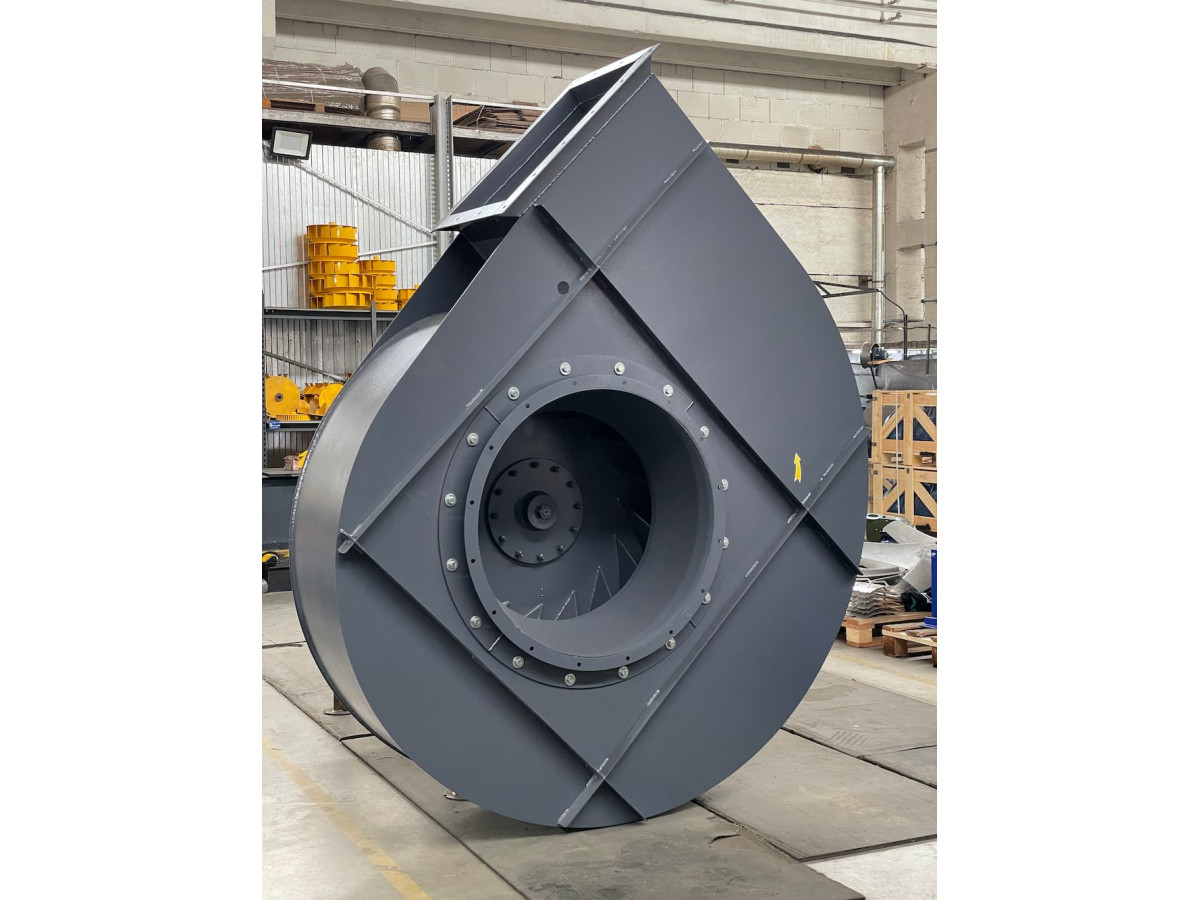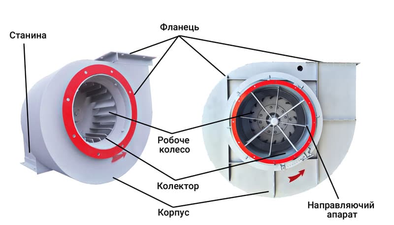 Загальна конструкція димососу складається з робочої камери, равлика, лопатки та робочого колеса. Відцентрові промислові вентилятори мають корпуси з міцної вуглецевої сталі, що гарантує тривалий ресурс і захист від високих навантажень. Якщо пристрій працює в агресивному середовищі, перевагу віддають моделям із нержавіючої сталі.